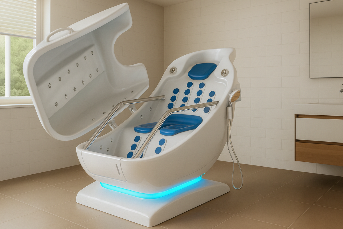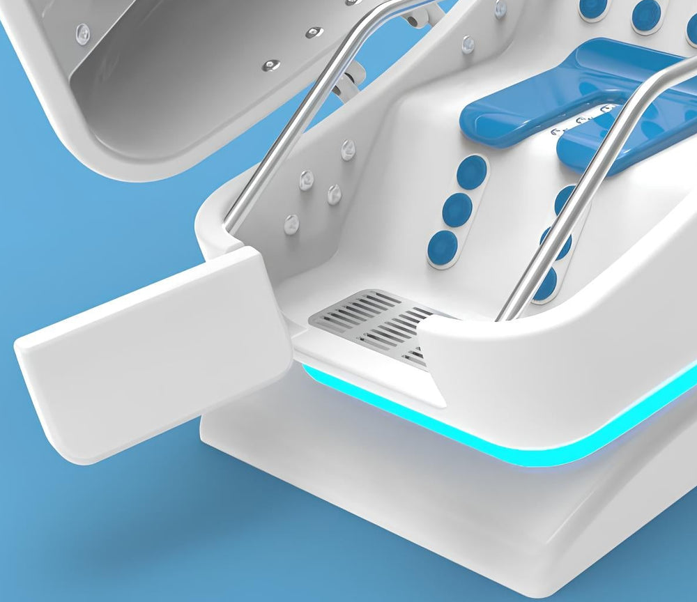 The HydroPod is a revolutionary autonomous hygiene pod for care homes, offering a safer, more efficient, dignified washing experience for elderly residents. It provides a spa-like wash using proprietary rotating bristles and water jets that mix soaps and cleansing agents for optimal hygiene.